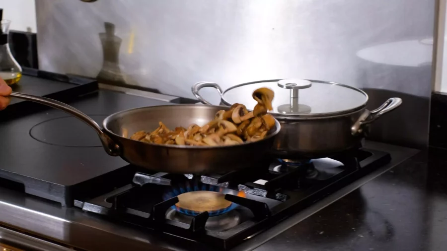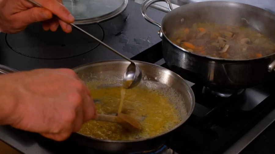 Préparer un roux blond en faisant revenir dans la sauteuse des champignons, le beurre et la farine.