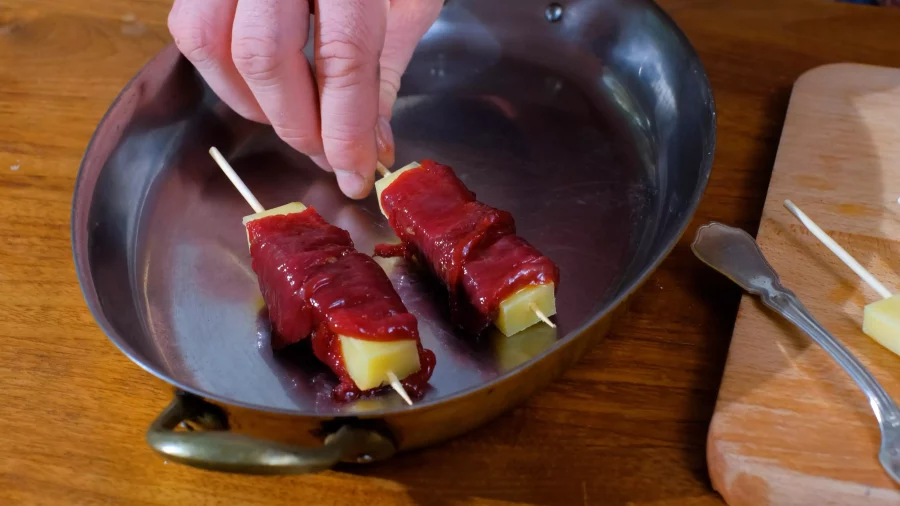 Enfoncer les morceaux de fromage sur les piques et les enrouler de viande.