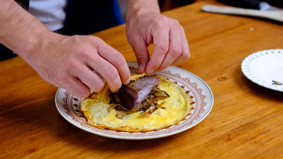 Placer l'omelette sur votre planche, ajouter les oignons puis le rôti de chevreuil, refermer l'omelette dessus.