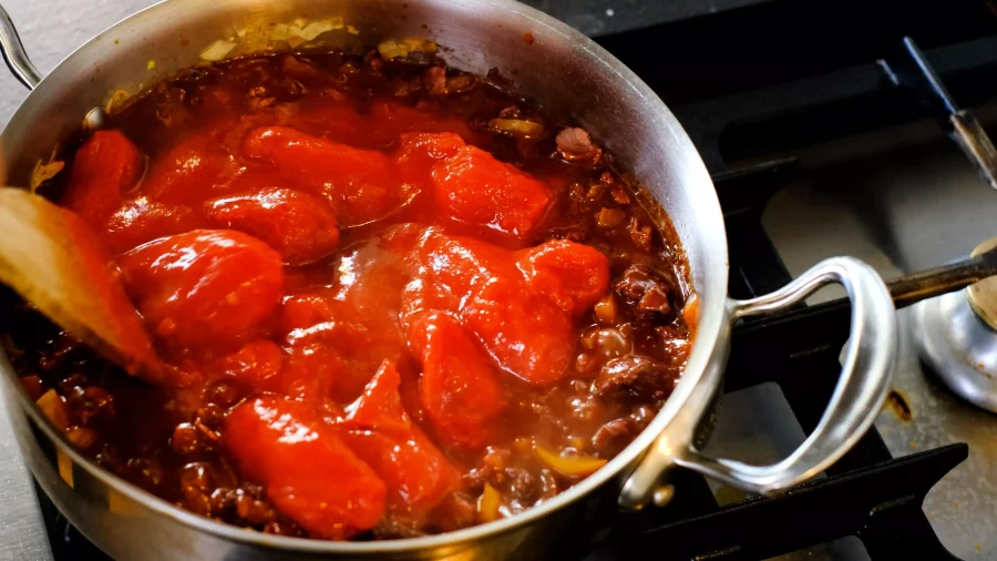 Ajouter le concentré de tomate et les tomates pelées et cuire 45 minutes.