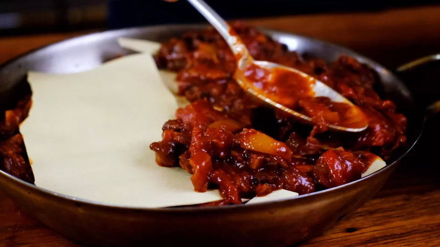 Dresser dans un plat en alternant la préparation de viande et les feuilles de lasagnes.