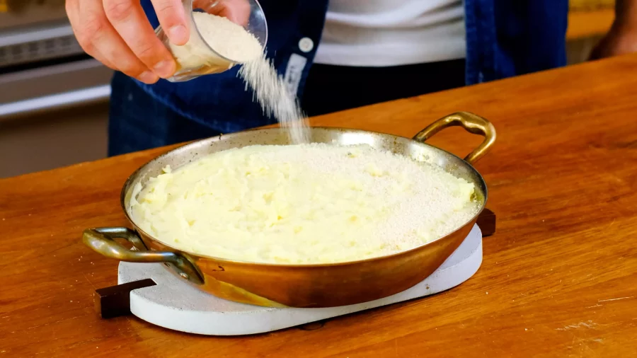Une fois cuites, écraser les pommes de terres avec du beurre, du lait et une pincée de fleur de sel et du poivre pour faire une purée.