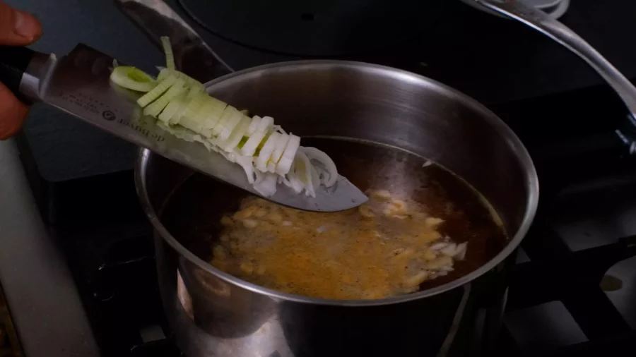 Dans une casserole, faire chauffer le bouillon de volaille. Y ajouter l’ail, le gingembre haché, la sauce soja, le mirin, le piment et laisser cuire 10 minutes.