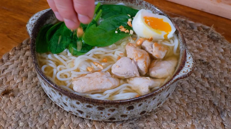 Dresser les nouilles dans un bol, ajouter du bouillon, des feuilles d’épinard, la cébette, un demi-œuf et parsemer de cacahuètes.