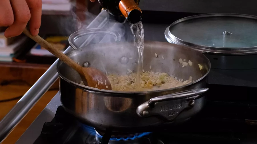 Retirer la viande, ajouter l’oignon émincé finement, puis le beurre. Laisser cuire 1 minutes puis ajouter le riz et colorer 3 minutes encore.