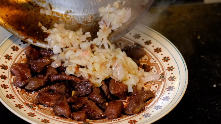 Retirer le sanglier de la poêle et ajouter dans la même poêle l'ail et l'oignon ciselés.