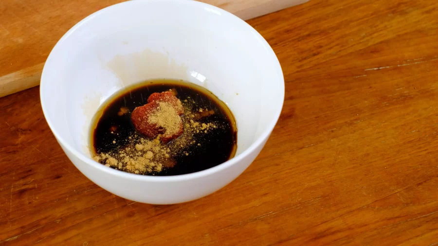 Mélanger le vinaigre de riz, le mirin le soja, le miel, le concentré de tomate, le gingembre et l'huile de sésame et verser sur le cerf.